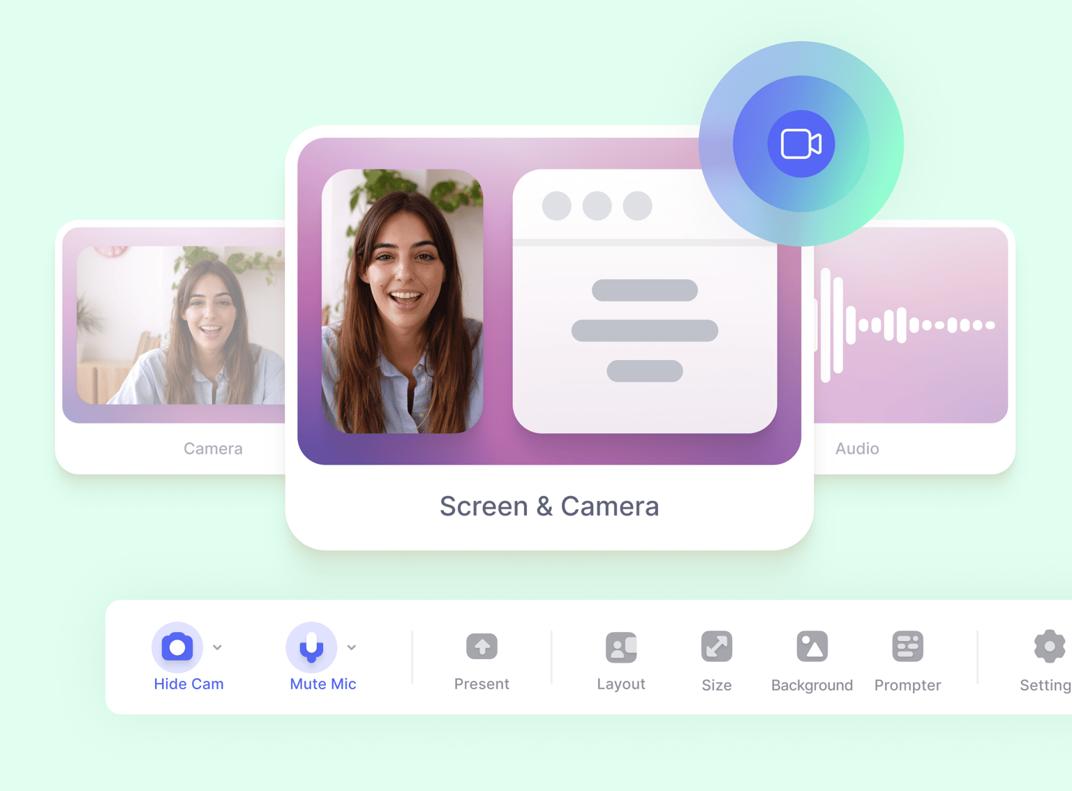 Select the layout that best suits your video’s purpose. The video editing software lets you do video recording, audio recording, or both at the same time. You can present your slides by sharing your entire screen so you can record business presentations. Choose where your camera is displayed—put it side by side with your screen, overlay your video, and more.