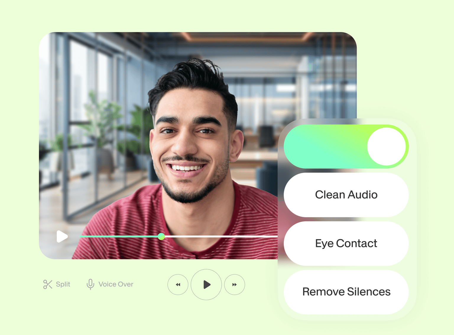 Wondering how to screen record on PC and Mac and also edit your video? The built-in video editing software is packed with a full suite of AI-powered tools to help you polish your video. Correct eye movements instantly with our webcam eye tracker. You can remove your background in one click to hide the clutter in your home office, clean your audio, and remove filler words to make you sound well-prepared in your presentation—all with AI!