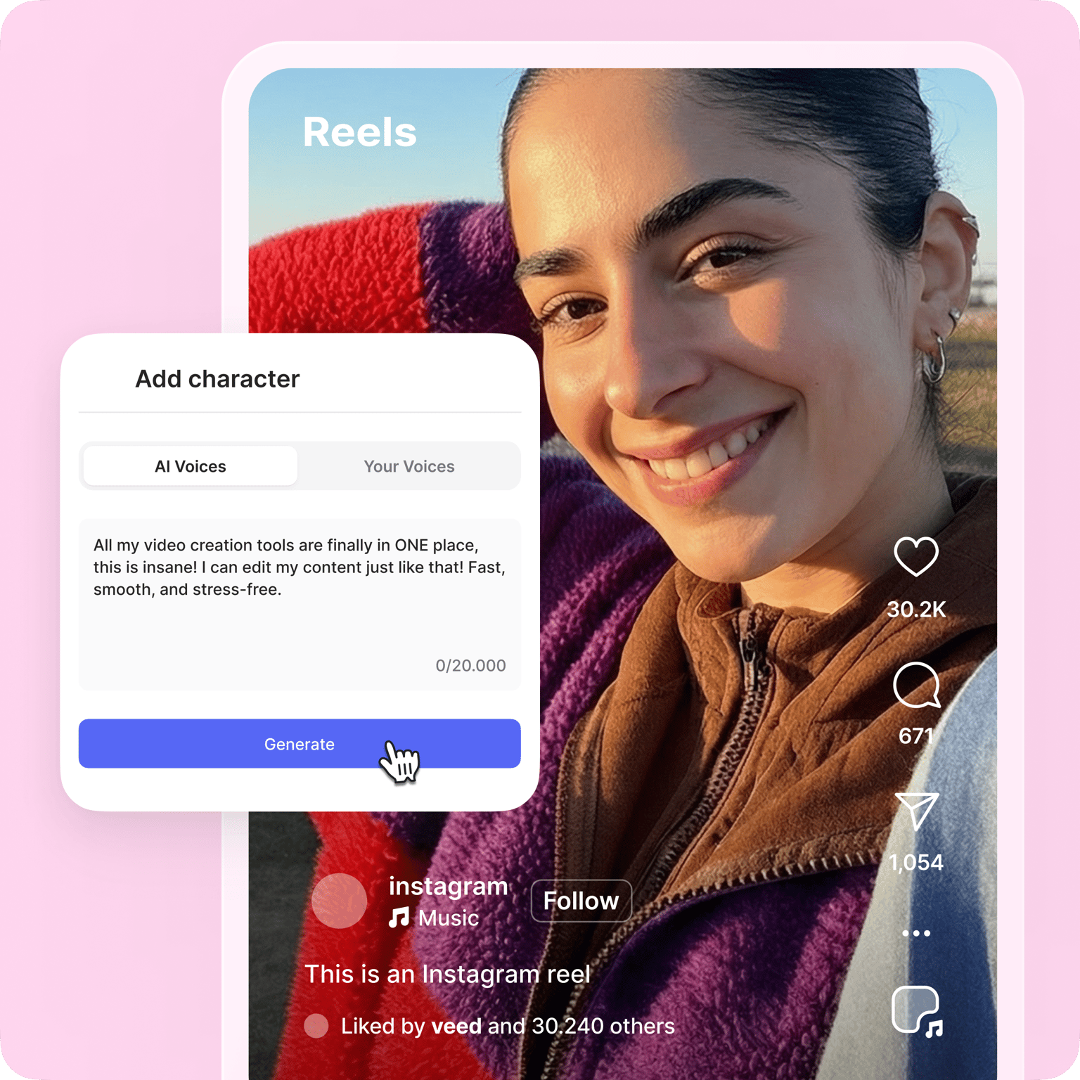 VEED lets you do so much more than just generate scripts, AI avatars, and AI voiceovers. It’s an all-in-one professional video editing software that lets you create stunning videos in minutes. Streamline your content creation process. We have a powerful AI video generator that turns your text prompts into videos instantly. Plus, you can use our video templates instead of starting from scratch. Create sales videos, marketing ads, social media content, and so much more. Explore our AI video editing tools today!