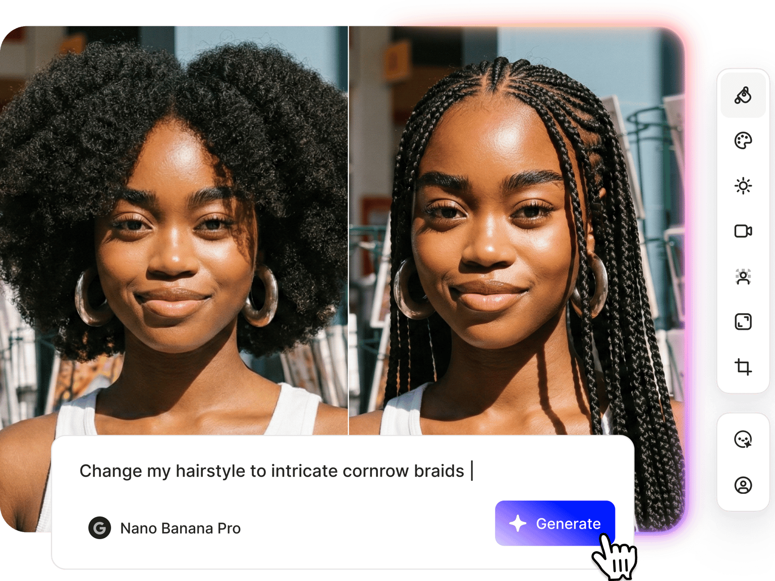 Describe the braid style you want, and VEED generates it on your photo. Specify braids, length, and color in one prompt. The AI braids filter isn't limited to preset options, so you can explore different styles and compare results. Try cornrow styles or longer braids. You can even change your hair color by including it in your prompt.