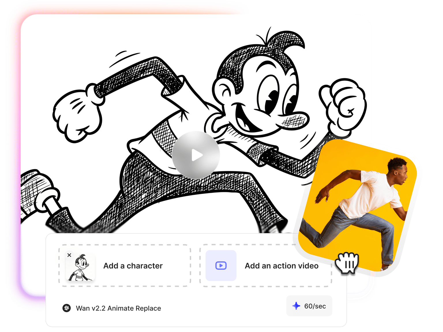 Upload your video and a sketch character image to our video-to-sketch converter. The AI transfers your movements and expressions onto the sketch character, creating hand-drawn style animations. Every detail transfers—head tilts, hand gestures, facial expressions. Choose Wan 2.2 Animate Move to animate a sketch character image with your video's movements, or Wan 2.2 Animate Replace to swap the person in your footage with a sketch character.